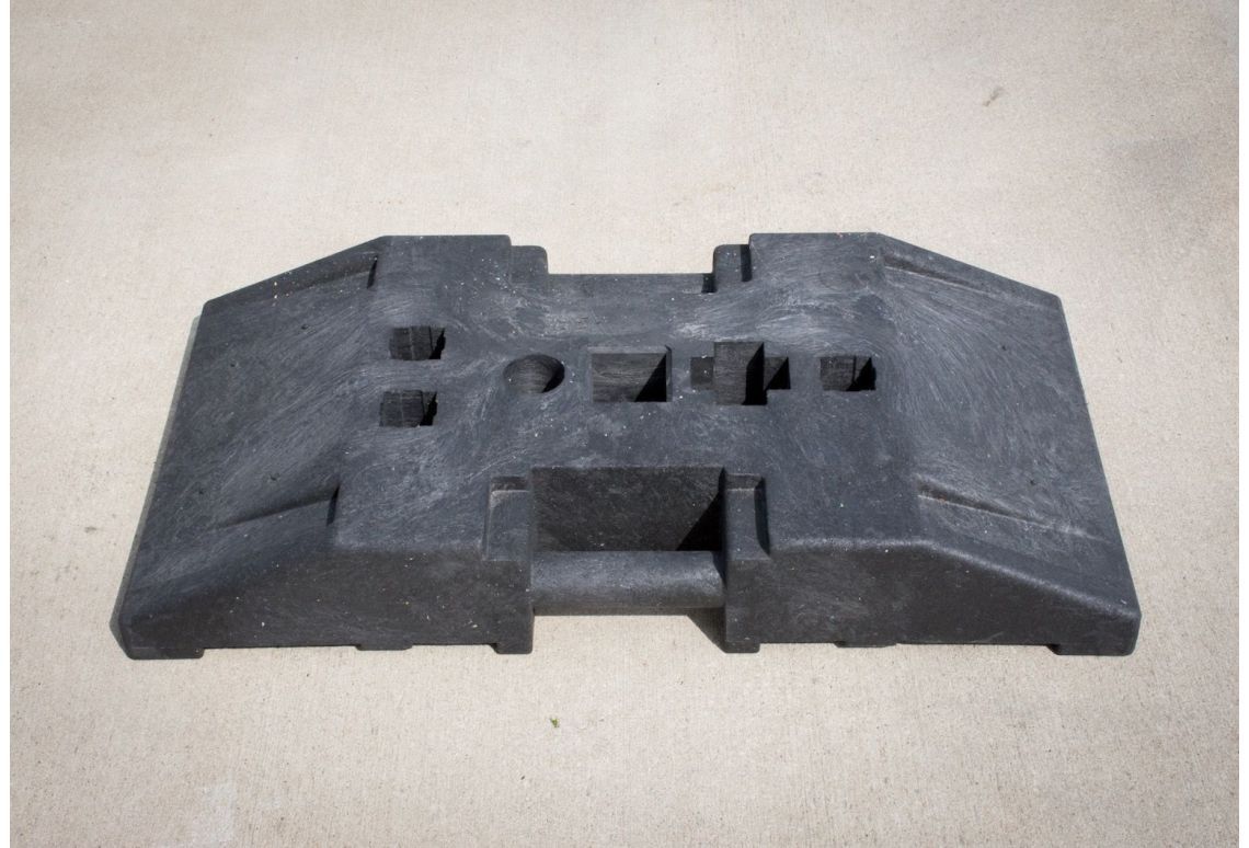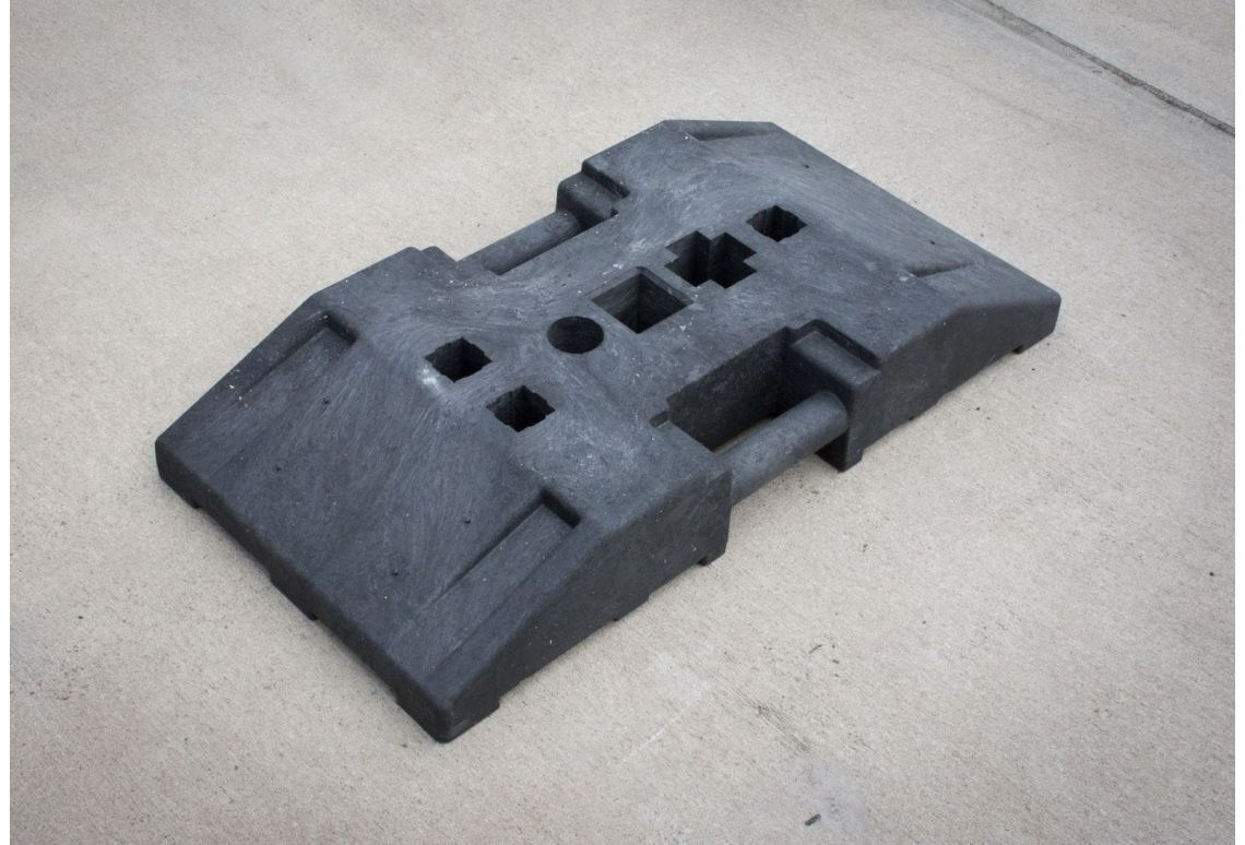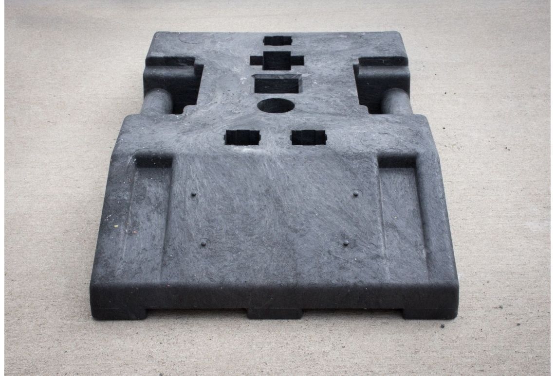 De baakvoet is gemaakt van gerecycled kunststof. In de voet zitten verschillende uitsparingen die kunnen worden gebruikt om onder andere een geleidebaken, een verkeersbord op een buispaal of een kunststof dranghek in te plaatsen.