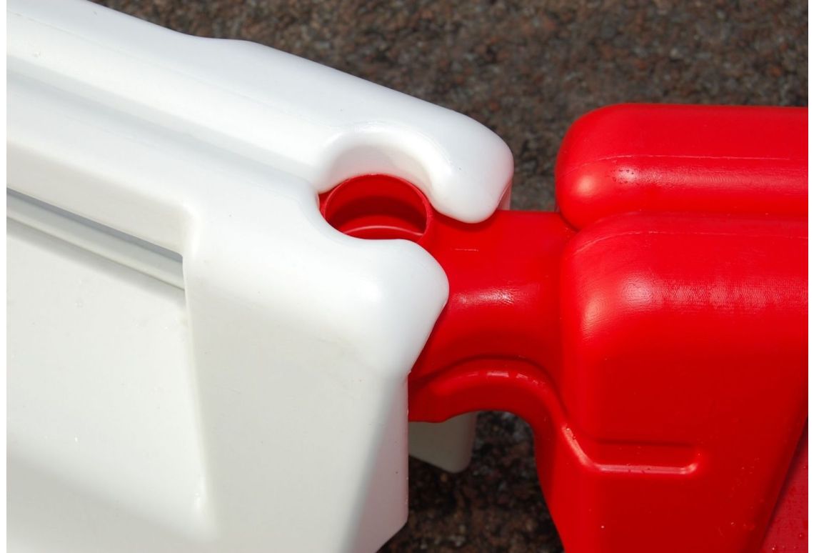 De barrier is gemaakt van een hoogwaardige kwaliteit gerecycled kunststof. Ze zijn makkelijk te stapelen, zodat er veel barriers tegelijkertijd kunnen worden vervoerd en opgeslagen in een kleinere ruimte.